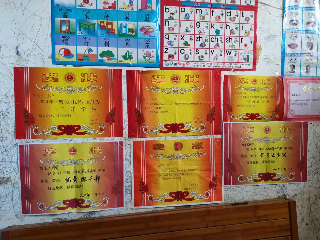 来到村民家中,服务团的成员递上准备好的慰问品。一部分成员向家长了解孩子的情况,另一部分的成员则与小朋友交流玩耍。通过陪伴与交流,逐渐走入小朋友的内心,去了解小朋友们的心理状况。印象最深的是一对双胞胎,哥哥和弟弟的奖状挂满了整面墙壁。但当成员问及未来的梦想以及是否想上大学时,小朋友只是迷茫的眨了下眼睛,摇了摇头。