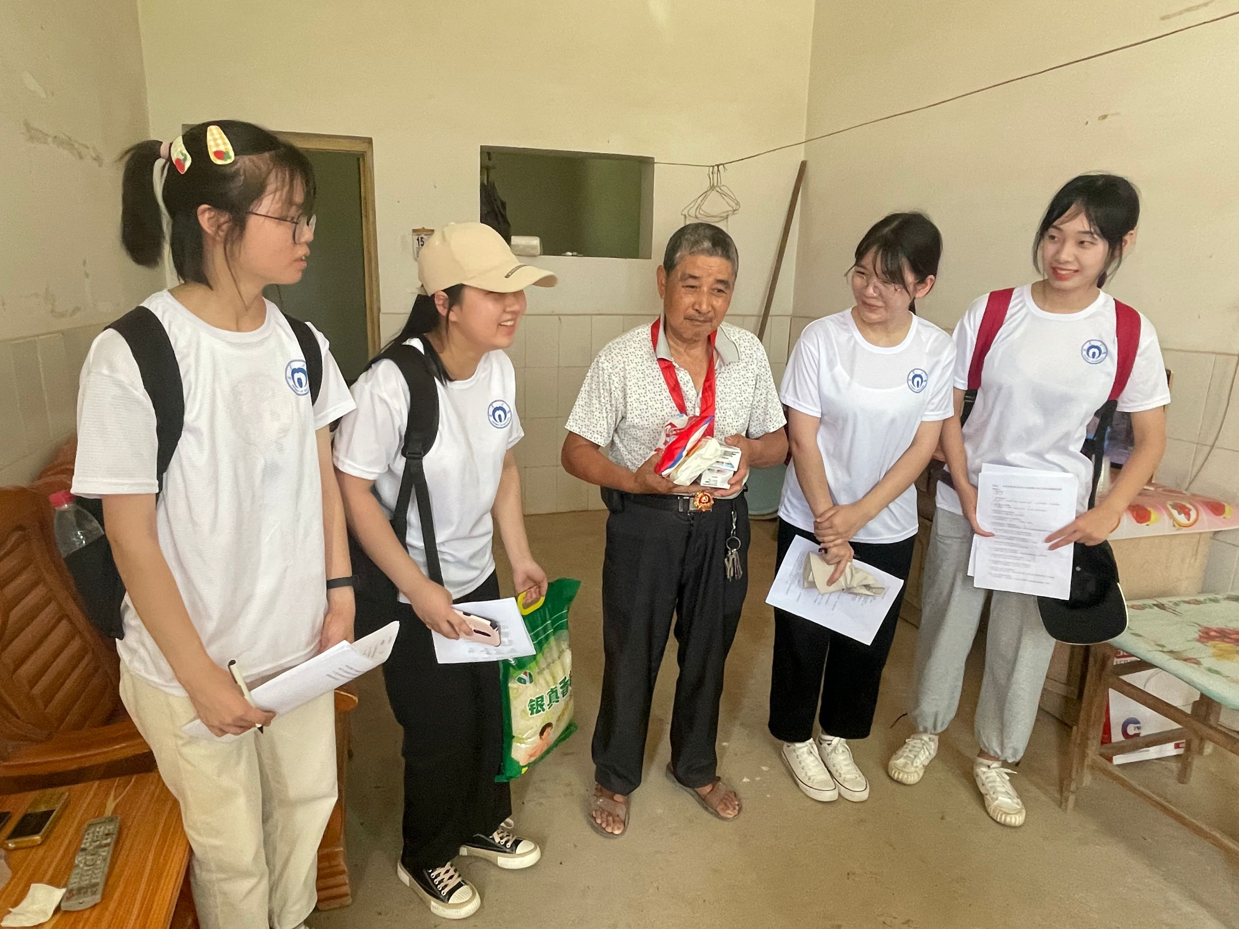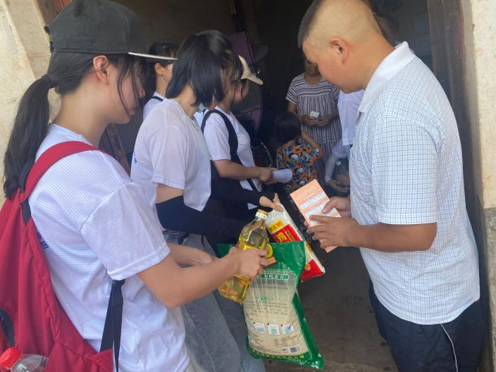 入户走访调查中,团队给贫困户、低保户和独居老人等困难户家庭发放慰问品,包括米、油、面和面粉等等,以表达团队成员对困难户家庭的关心和慰问。