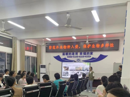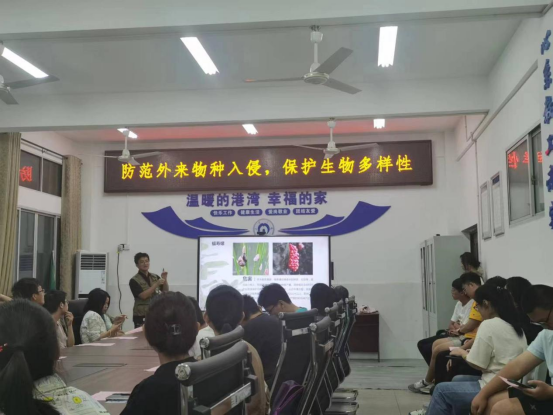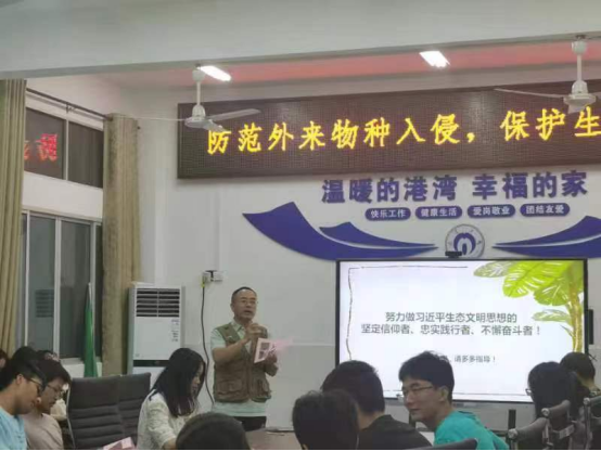 9月7日晚上,资环安公司的张晓文老师、唐东山老师带领湖南省绿色卫士衡阳绿雁大队和学校环保协会的志愿者们在公司的多媒体会议室进行了主题宣讲,听众为大一大二员工和其他环保爱好者60余人。宣讲内容主要包括:一、 习近平生态文明思想与实践;二、 中华人民共和国生物安全法;三、防范外来物种入侵;四、保护生物多样性。宣讲之后,大家就“两山”理论以及当前关注的“鳄雀鳝”、“一枝黄花”等热点外来物种进行了热烈的提问、讨论等互动活动。
