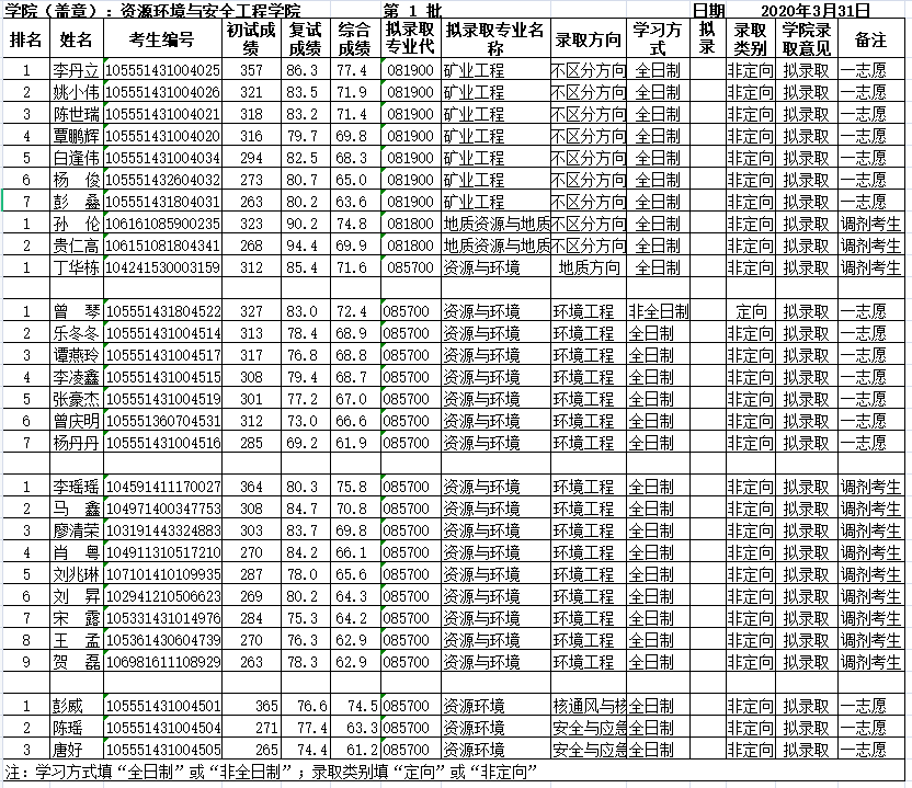 注:矿业工程/资源与环境(矿业方向)、安全科学与工程/资源与环境(安全方向)的第一批调剂尚未结束。