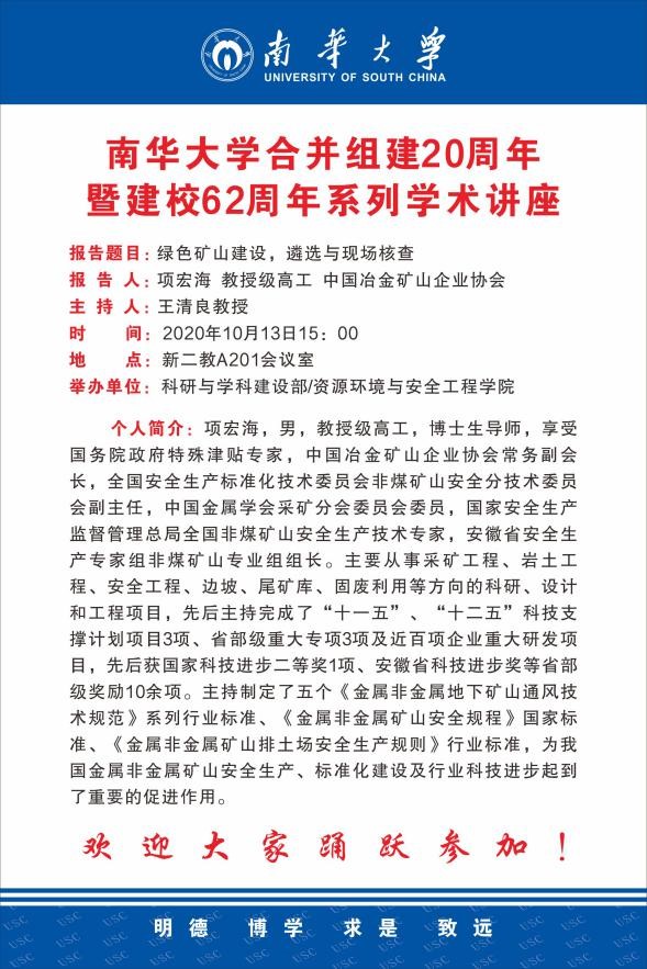 10月13日下午,中国冶金矿山企业协会常务副会长项宏海教授应邀在公司201会议室为师生进行了“绿色矿山建设、遴选与现场核查”学术讲座;此次讲座为公司合并组建20周年暨建校62周年系列高水平学术报告。报告会由王清良副经理主持,项宏海教授向师生详细介绍了国内外绿色矿山建设的实践与发展,并提出在绿色矿山建设中能开展的研究领域。