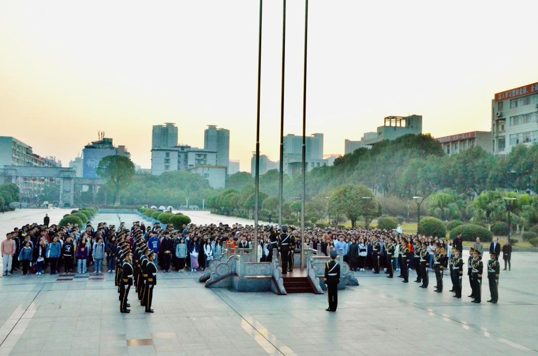 在全体师生的注目下,国旗班迈着整齐的步伐护卫着国旗走入场内。伴着庄严而嘹亮的国歌,五星红旗冉冉升起,迎风飘扬。全体师生怀着对祖国的热爱及崇高的敬意,向国旗行注目礼。鲜艳的红旗如同火焰般点燃了在场每一个人心中的热情,并成为南华上空的一抹绚丽的色彩。
