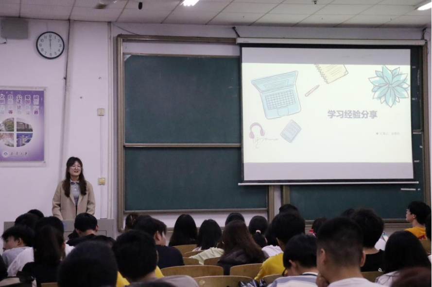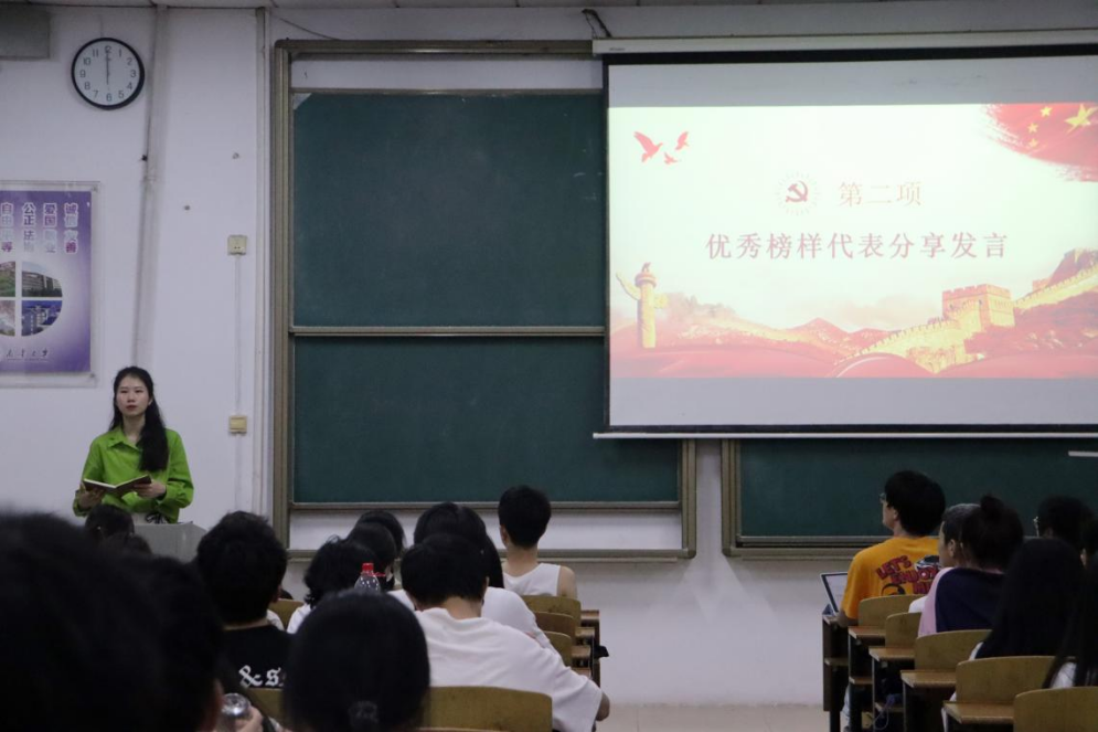 会议第二项,四位优秀毕业生党员代表分享了自己的学习和成长经验故事。环境工程专业四年成绩第一、保研至湖南大学的金楚佳同学分享了自己大学四年的学习方法与经验,提醒大家课堂时间尤为珍贵,课后要温故知新;保研排名综合第一、保研至华南理工大学的杨璇同学给大家分享在大学怎么提高科研创新能力,可以从哪里获取科研锻炼等等;考研至复旦大学的戴桂同学对她的考研之路进行了经验分享,她告诉学弟学妹们,不忘初心,脚踏实地,迎难而上是考研路上不可或缺的优秀品质;湖南省优秀毕业生薛钱蕾同学带来了“感时代律动,做时代青年”的主题分享,同学们对于大学怎么全面去提高综合素质能力感触颇深,感悟到了榜样的力量。